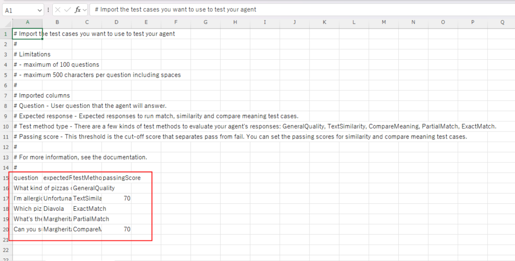 Test method type(テストメソッドの種類): エージェントの回答を評価するためのいくつかの手法があります。指定できるのは以下の通りです: