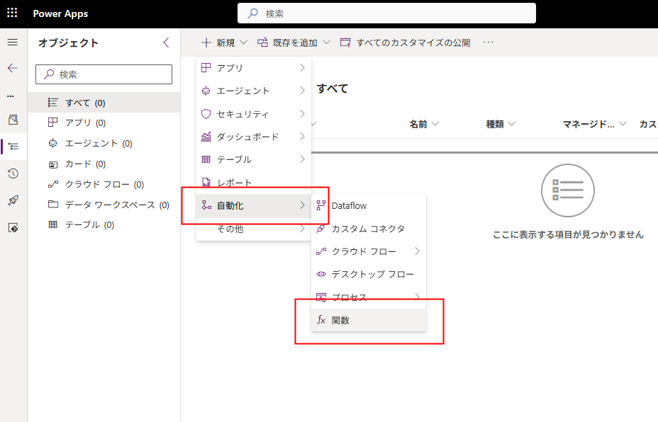[新規]→[自動化]→[関数]を選択。