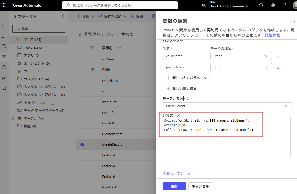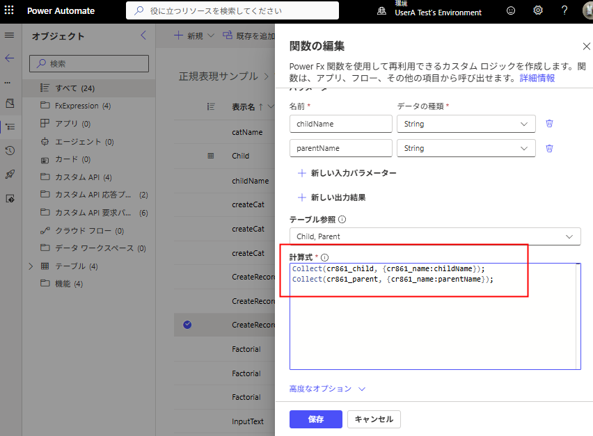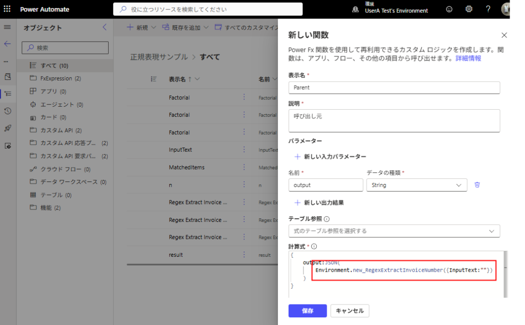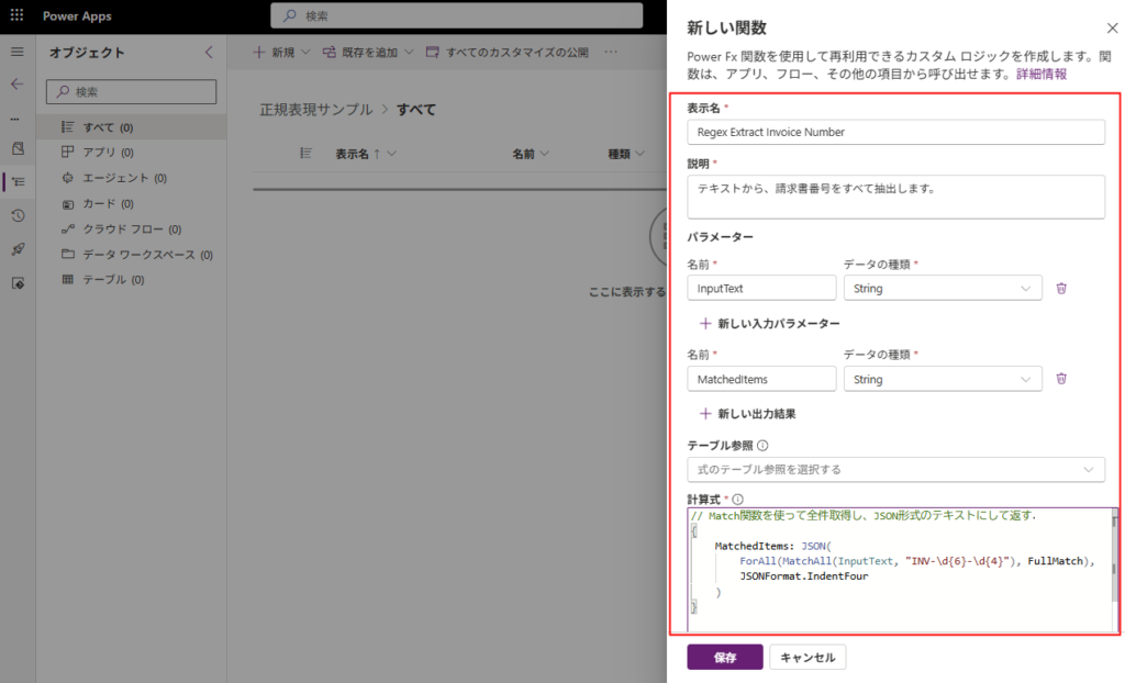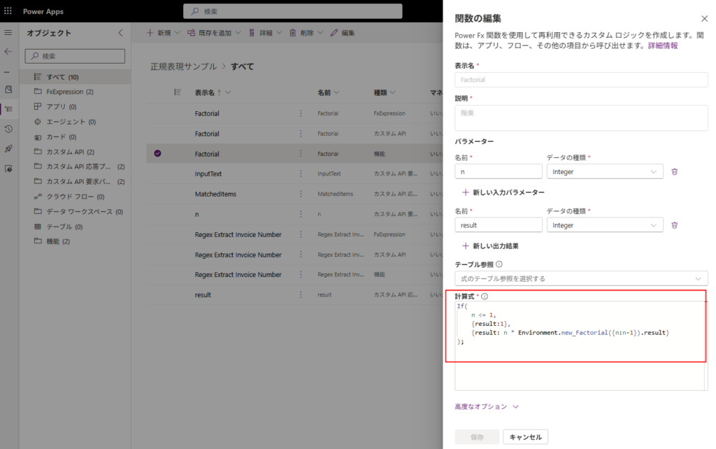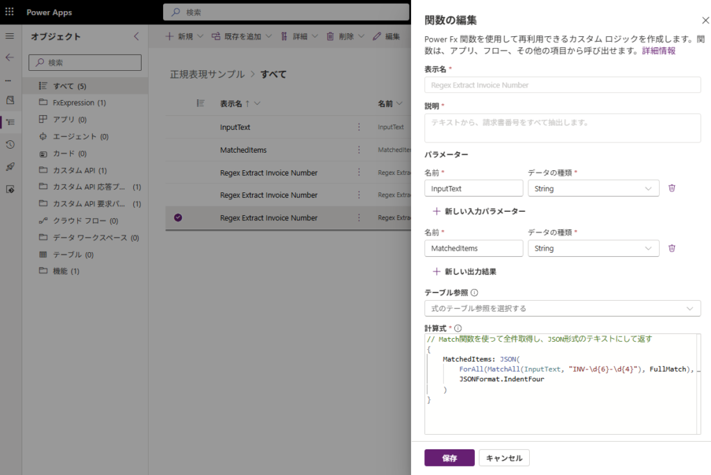 表示名、説明、パラーメータ、計算式(Power Fx)を書いたら、[保存]を押す。