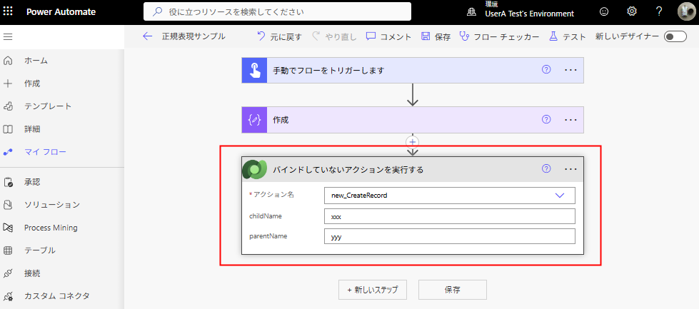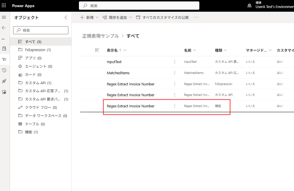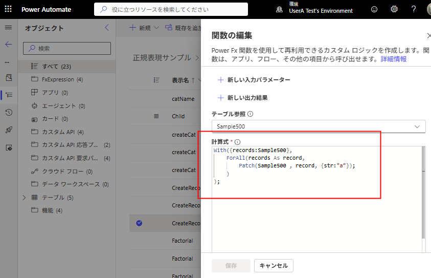 新しい関数を作成し、キャンバスアプリと同様Environment経由で作成済みの関数を呼び出せる。