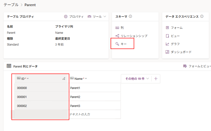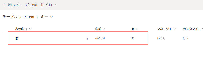 まず、参照される側のテーブル(今回はParentテーブル)に一意の値が入る列(IDとかオートナンバーとか)をつくり、[キー]を押す。