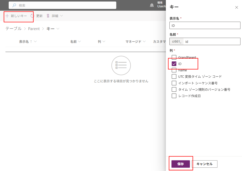 [新しいキー]から先ほどの一意の値が入る列を選択して、キーを保存する(名前はわかりやすければなんでもOK)。