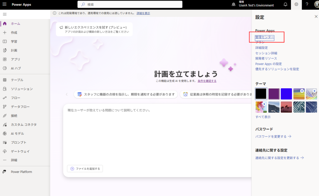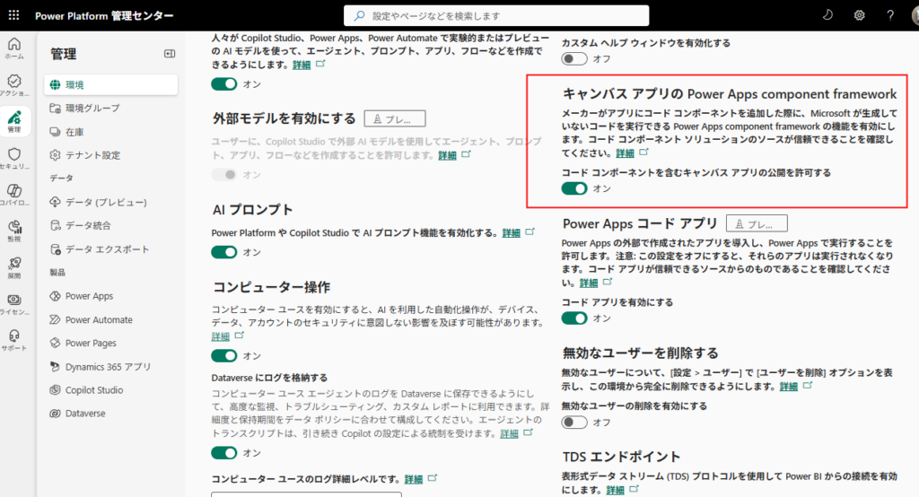 Power Apps Component Frameworkをキャンバスアプリで使うには、まず環境の設定を変更する必要がある
