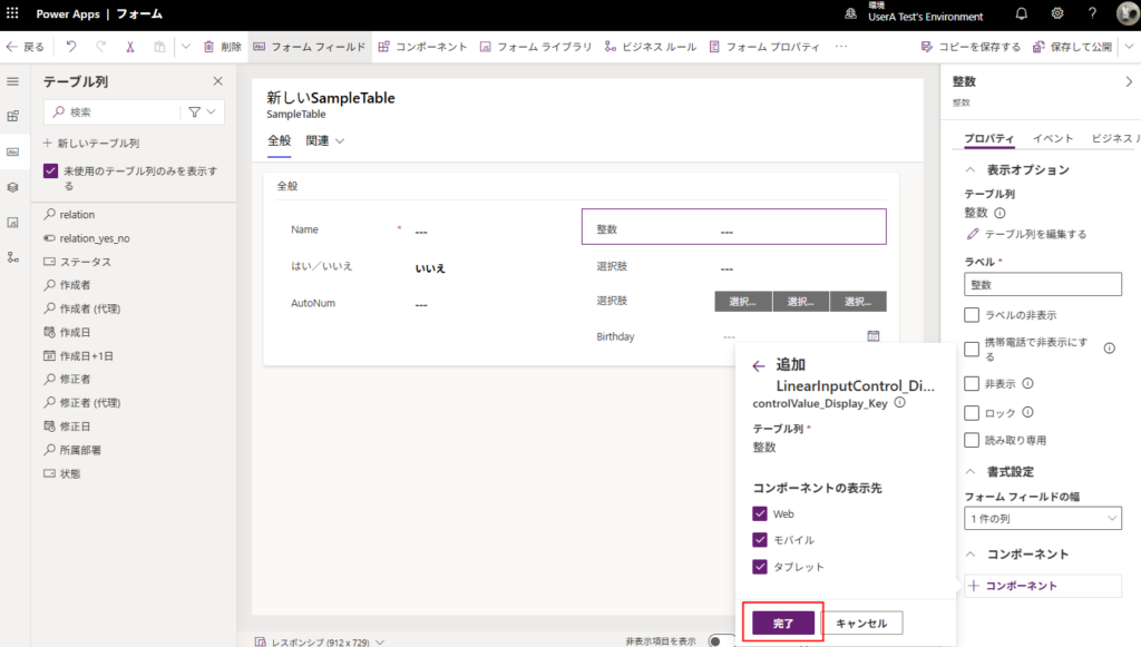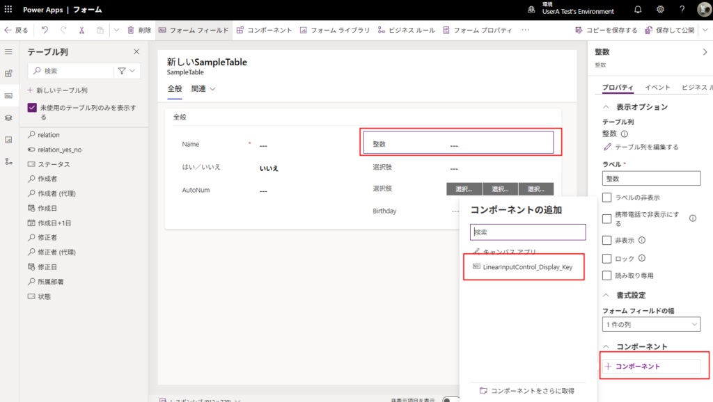 対象のテーブルのメインフォームを開いて、列を追加。そしたら画面右下の[コンポーネント]から作成したコンポーネントを選ぶ。