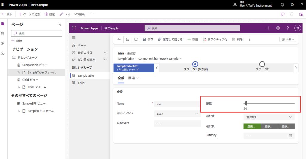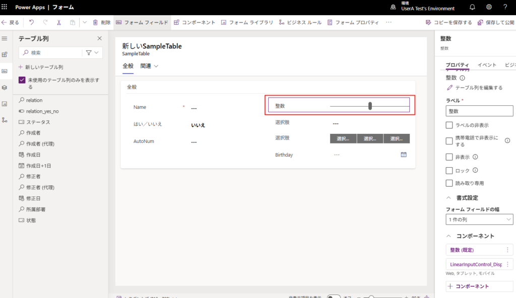 今回はこんな感じで整数型の列を持つテーブルのフォームを、整数をスライダーで選択できるようにしてみる。